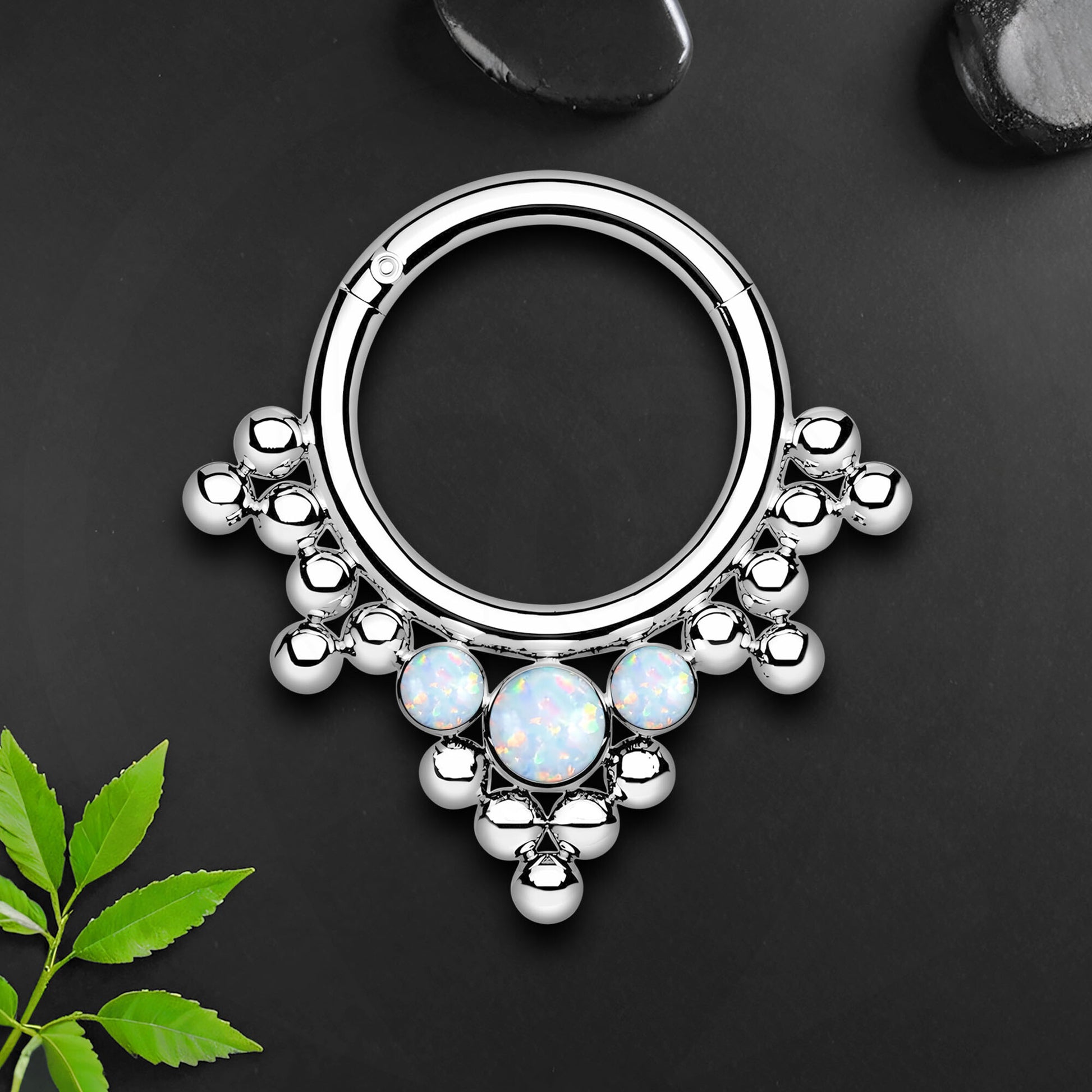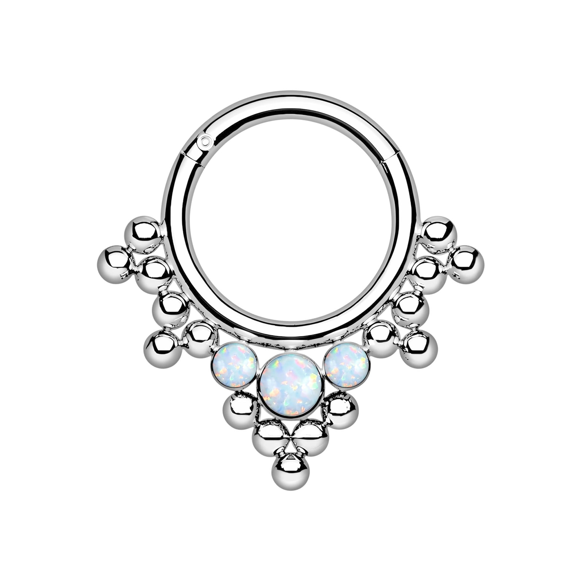 Premium materials like titanium, surgical steel, gold and platinum plating, Swarovski crystals, cubic zirconias, and natural opals.
