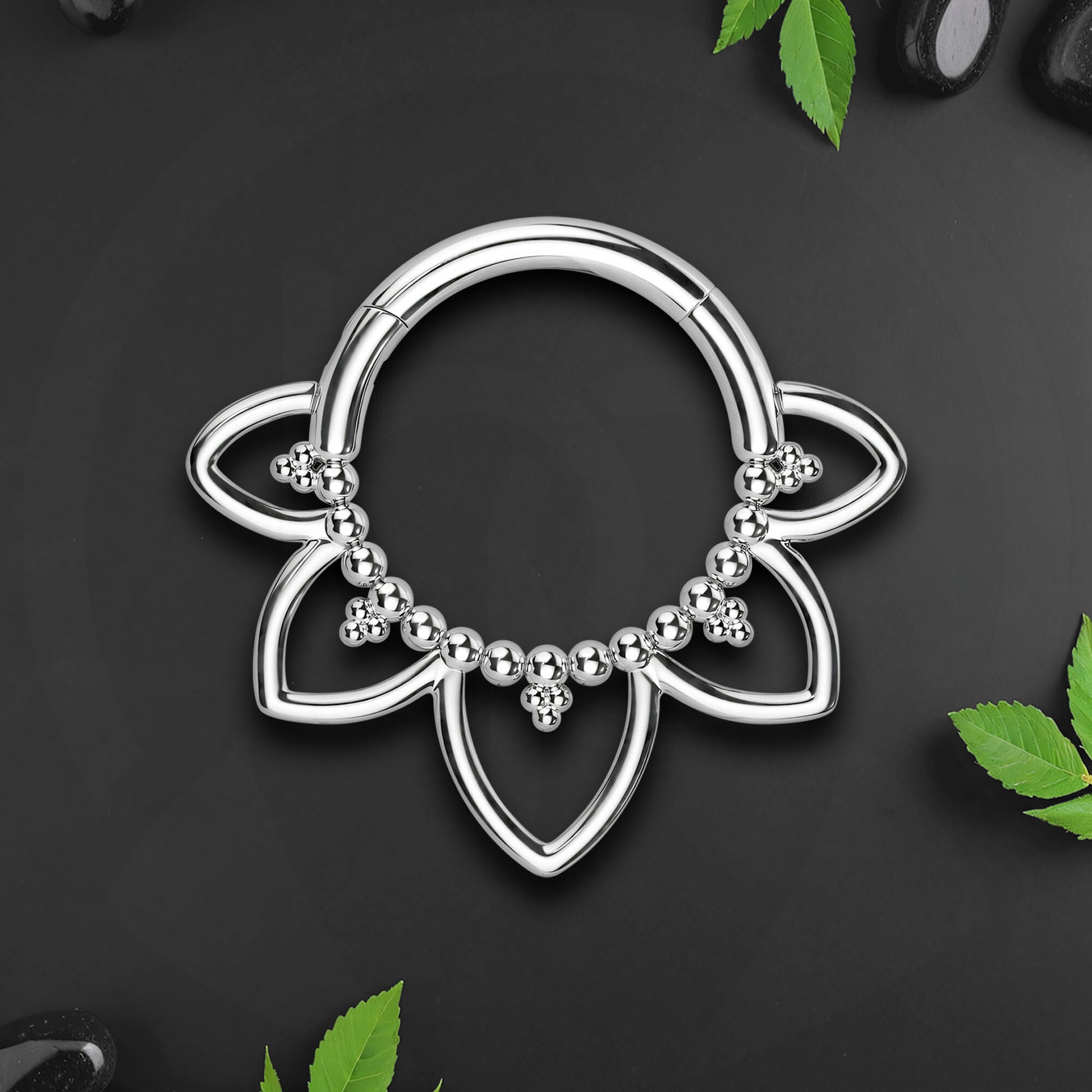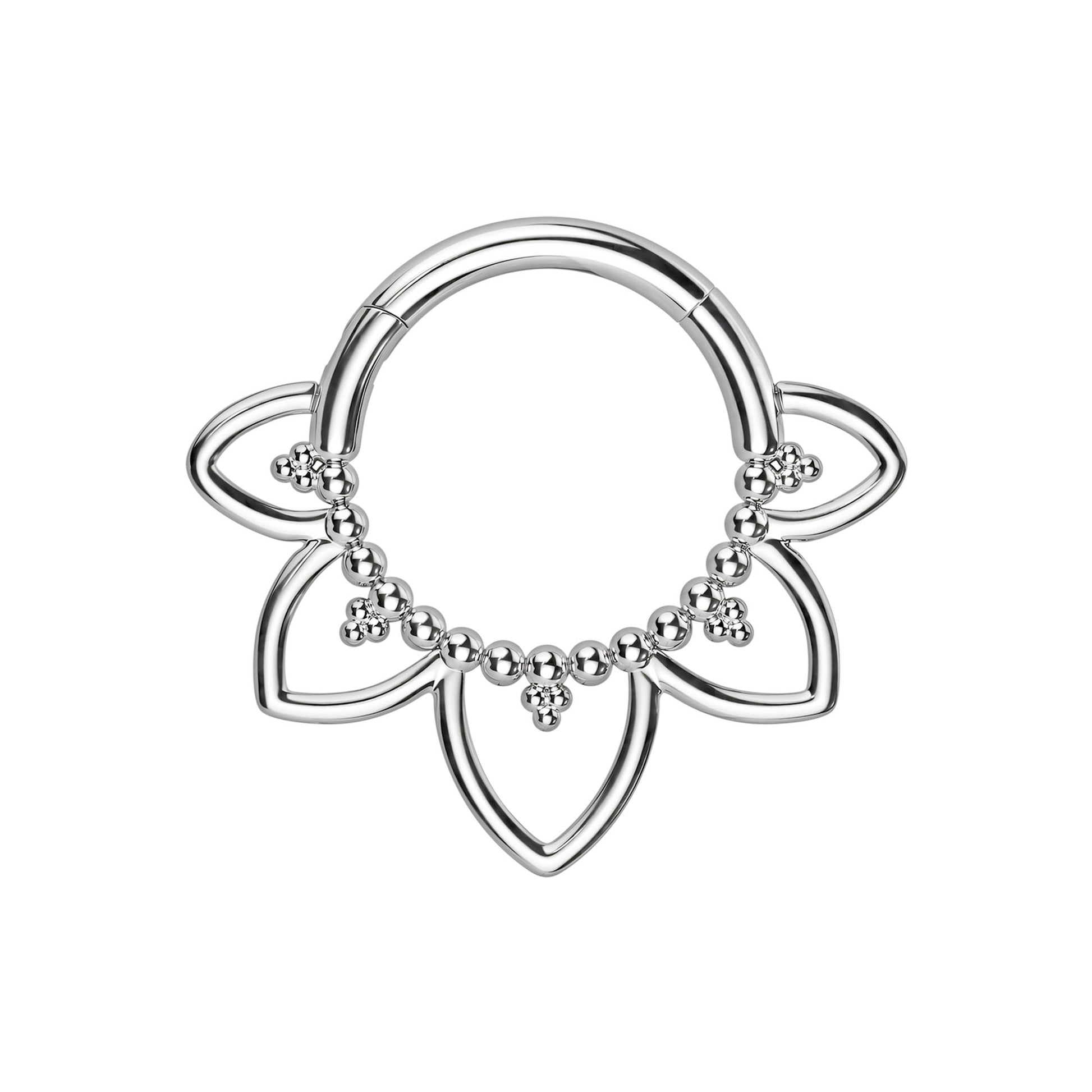 Premium materials like titanium, surgical steel, gold and platinum plating, Swarovski crystals, cubic zirconias, and natural opals.