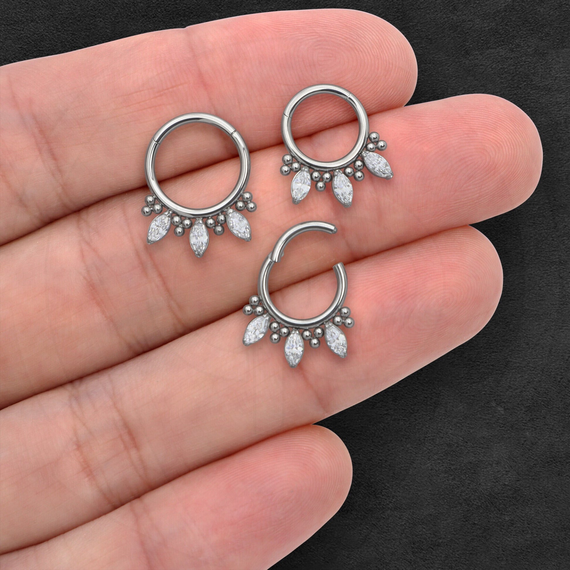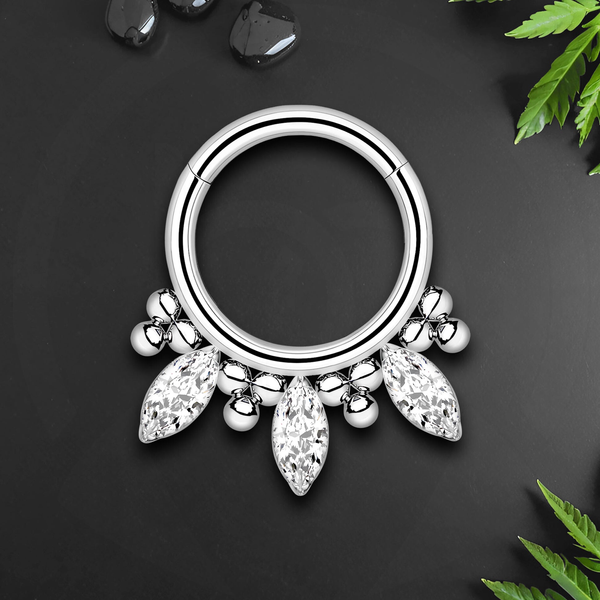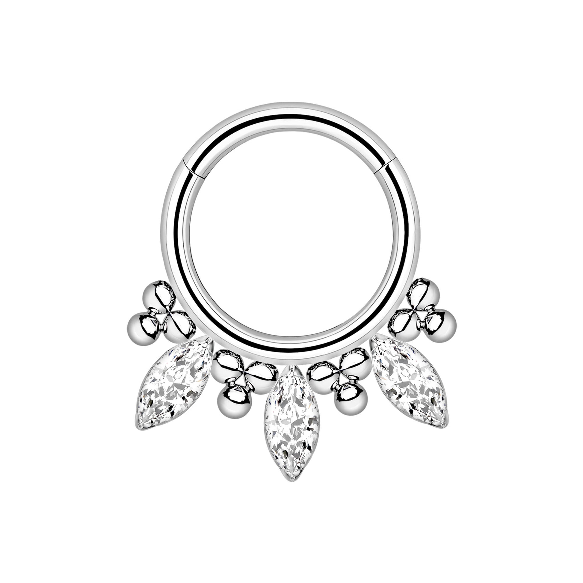 Premium materials like titanium, surgical steel, gold and platinum plating, Swarovski crystals, cubic zirconias, and natural opals.
