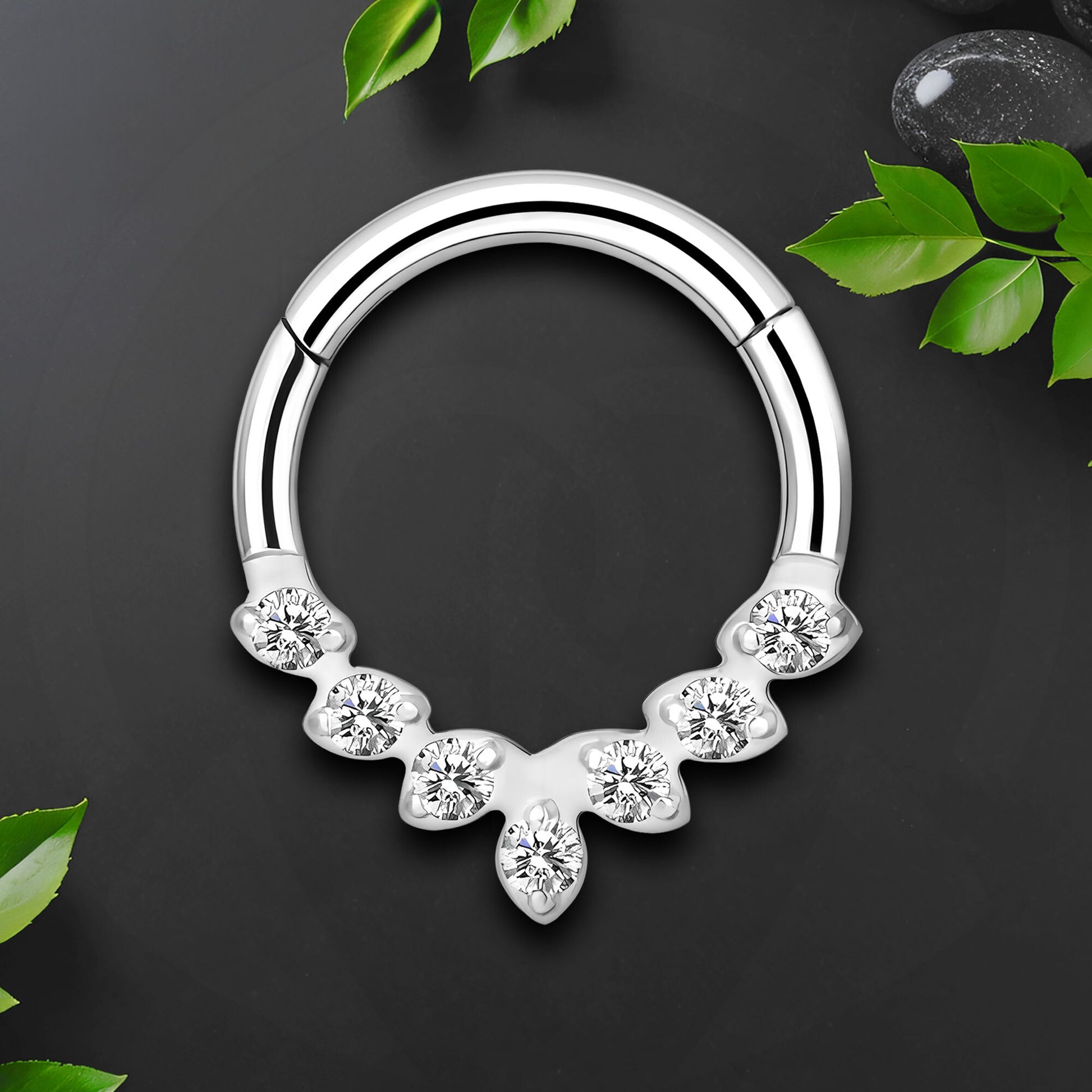 Premium materials like titanium, surgical steel, gold and platinum plating, Swarovski crystals, cubic zirconias, and natural opals.