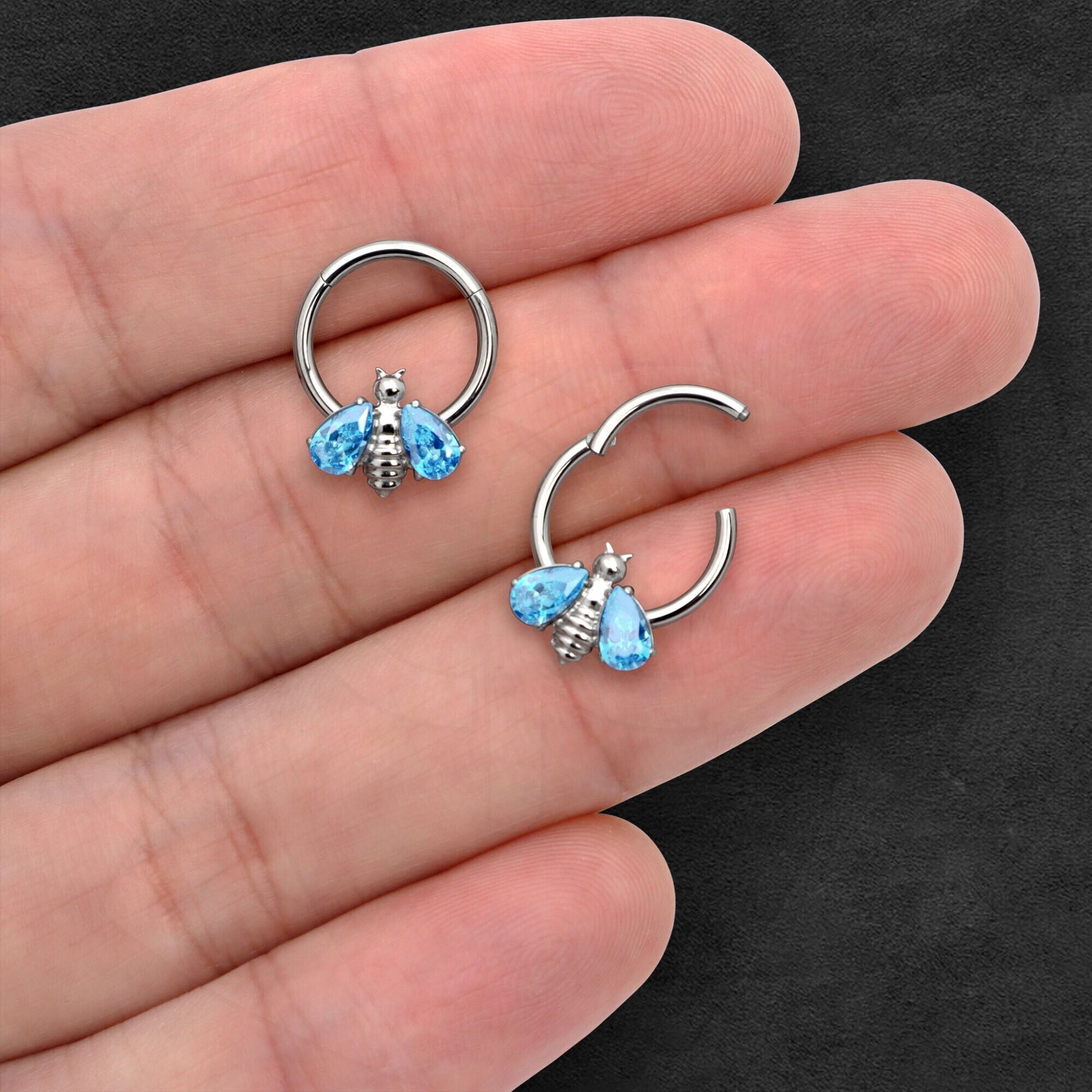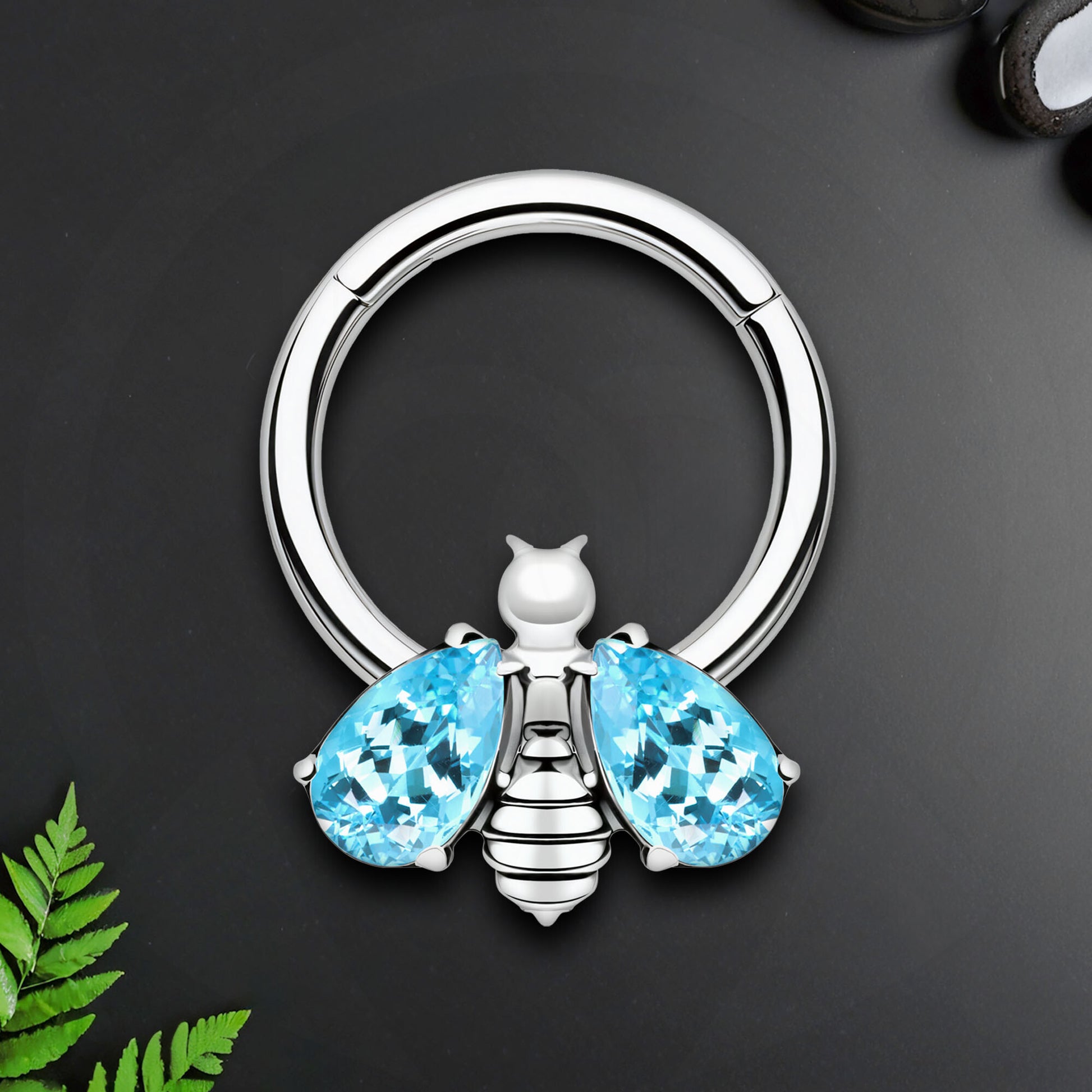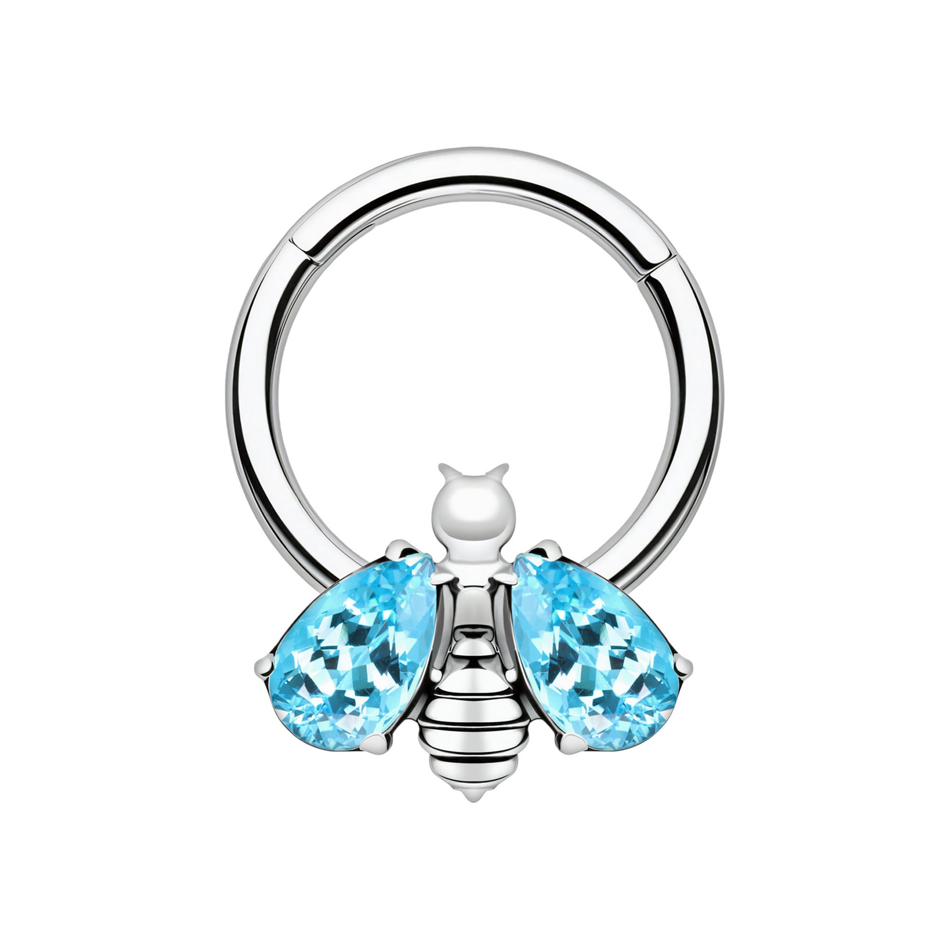 Titanium Clicker Ring with Bee Figure and Aqua Zirconia