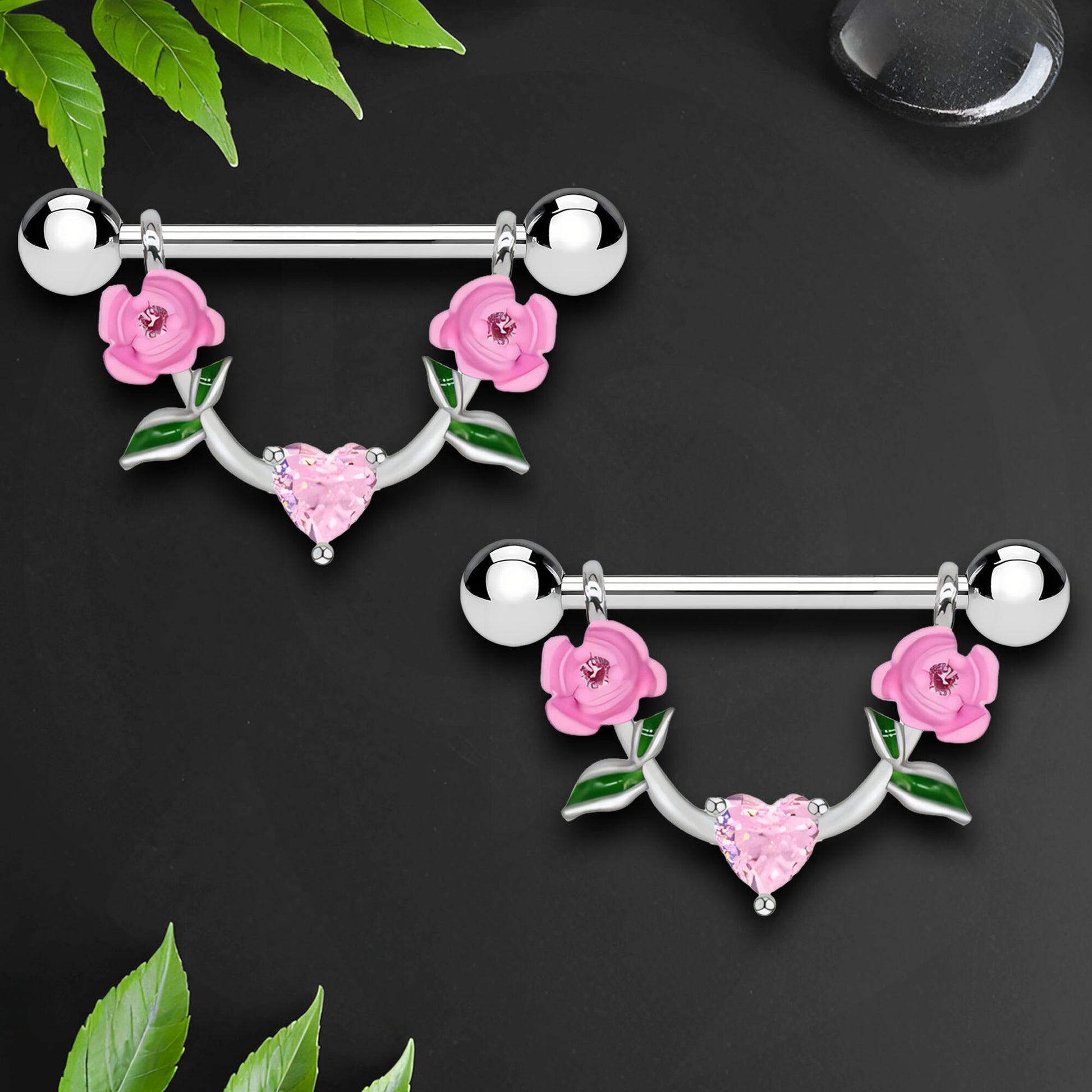 Surgical Steel Nipple Jewelry with Pink Heart and Roses