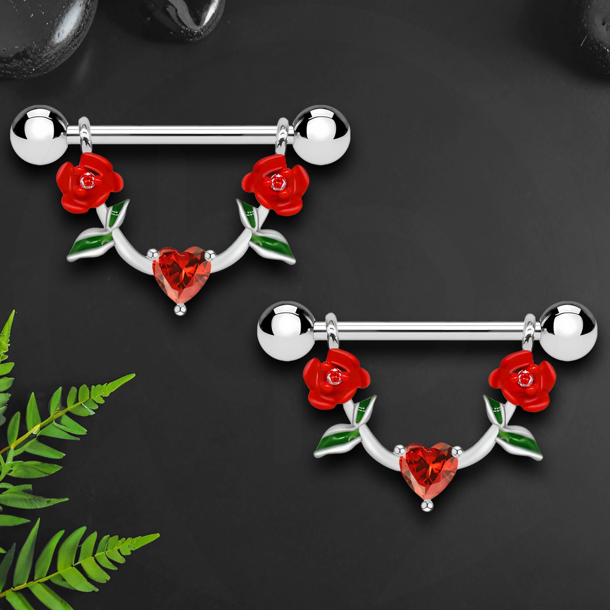 Surgical Steel Nipple Jewelry with Red Heart and Roses